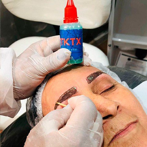 Una vez que la piel esté abierta (por ejemplo, después de trazar las primeras líneas del tatuaje o iniciar el procedimiento de microblading), aplicamos unas pocas gotas de TKTX Gel directamente sobre el área afectada.